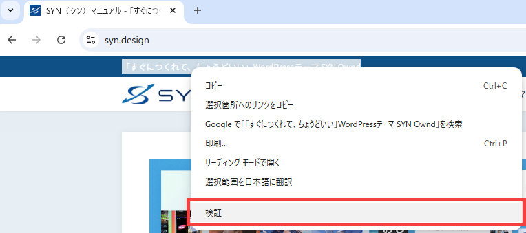 このとき、ブラウザのメニューから呼び出すこともできますが、変更したい箇所にマウスカーソルを合わせて右クリックし、表示されるメニューから「検証」をクリックすると、最初からその箇所が選択された状態でデベロッパーツールが開くため、とても便利です。