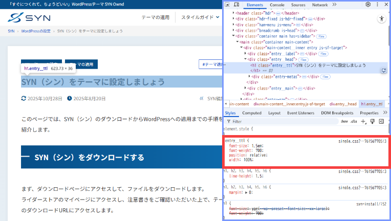 記事ページに移動し、デベロッパーツールで記事タイトルの要素を確認すると、以下のようなCSSが設定されています。