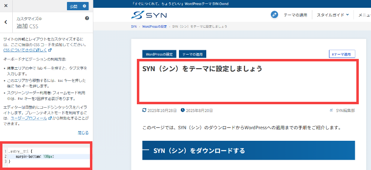 次に、「追加CSS」に先ほどのCSSを追加してみると、プレビュー画面にきちんと反映されていることが確認できます。