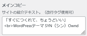 フッターに表示するテキストは、カスタマイズ > テーマの設定 > ヘッダー・フッターから、「フッター用のメインコピー」に入力ください。