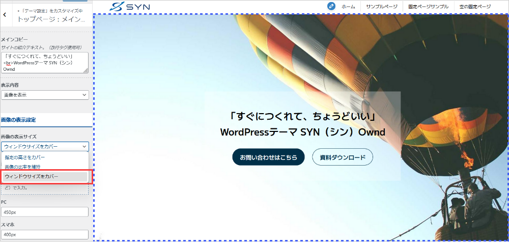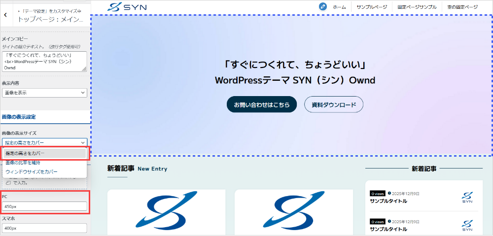アップロードするメインビジュアル用の画像のサイズ、比率にあわせて表示させます。