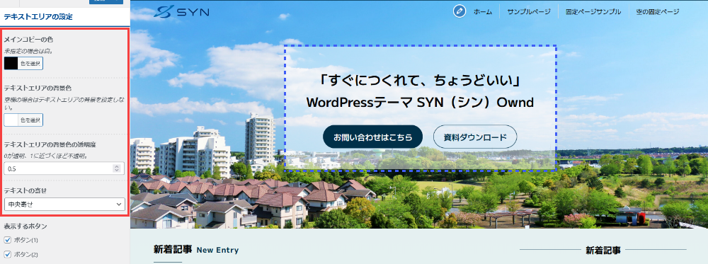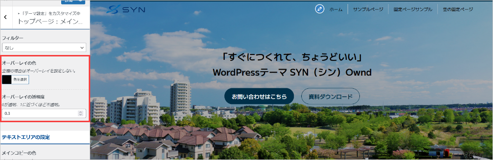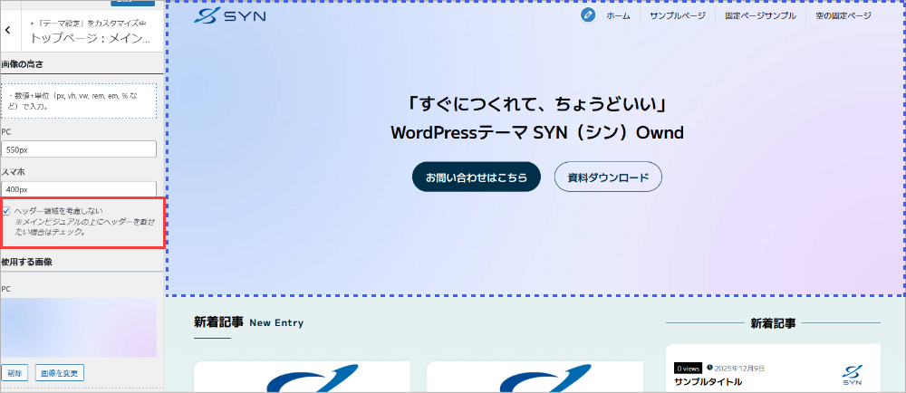 メインビジュアルの上にヘッダーを載せたい場合はチェックします。