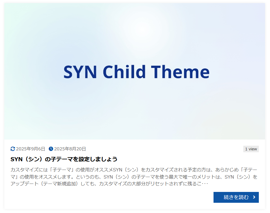 ブログ型は、1カラムで大きく表示され、アイキャッチ画像や投稿情報に加え、抜粋文も表示されるリスト形式です。