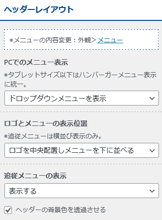 ヘッダー・フッターでは、ヘッダーの各要素の追加やロゴの調整をおこないます。