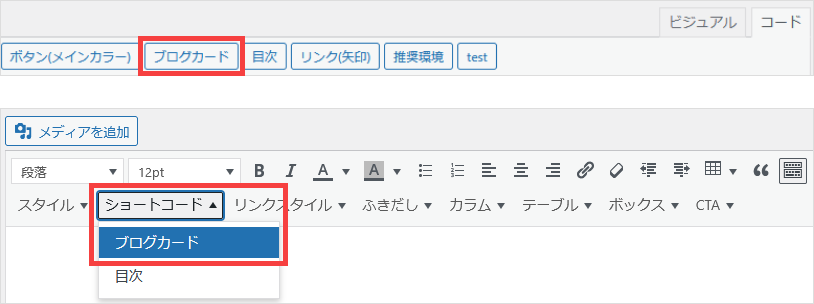 クラシックエディタ(ビジュアル・コード)では、上部にショートコード出力用のボタンがあるため、簡単に挿入可能です。